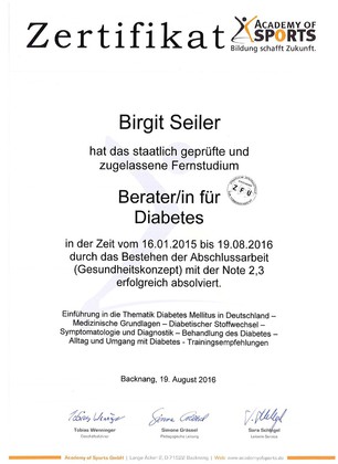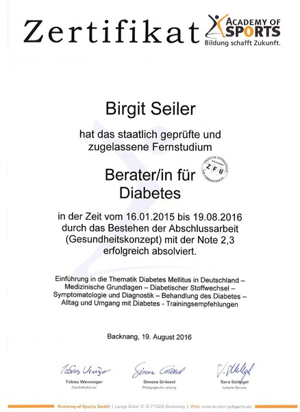 - Diabetesberaterin an der Academy of Sports in Backnang